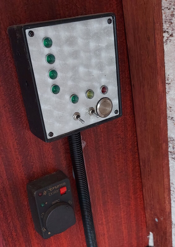 - Es gibt eine Fahr-Batterie, eine zweite normale Batterie und unten im Kleiderschrank zwei große Blei-Gel-Akkus, die über ein 80 A-Ladegerät(!) geladen werden.